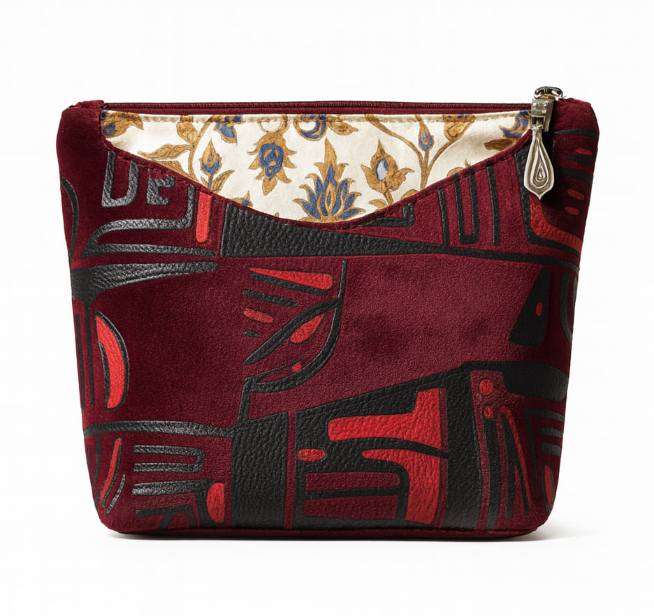 Bold, artistic, and unmistakably unique — the Maysa Abstract Burgundy Pouch is a modern statement piece inspired by Persian calligraphy and abstract art. Crafted from soft suede and vegan leather with raised geometric patterns in red and black, it features a smooth satin floral interior and a silver teardrop zipper pull. Perfect for makeup, accessories, or creative essentials.