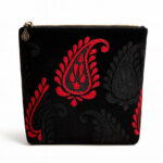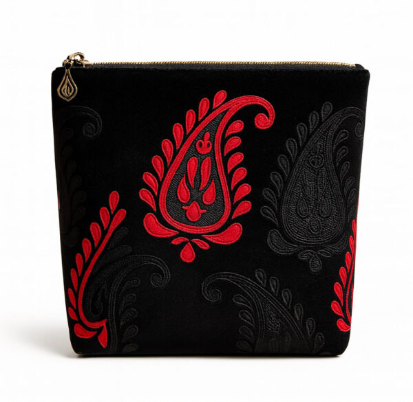The Maysa Black & Red Persian Paisley Pouch blends heritage and modernity in one striking design. Made from luxurious velvet, it features embroidered paisley motifs in bold red and matte black — symbolizing elegance and passion. With its smooth satin lining and gold teardrop zipper, this pouch is perfect for carrying your beauty essentials with a touch of Persian luxury.