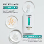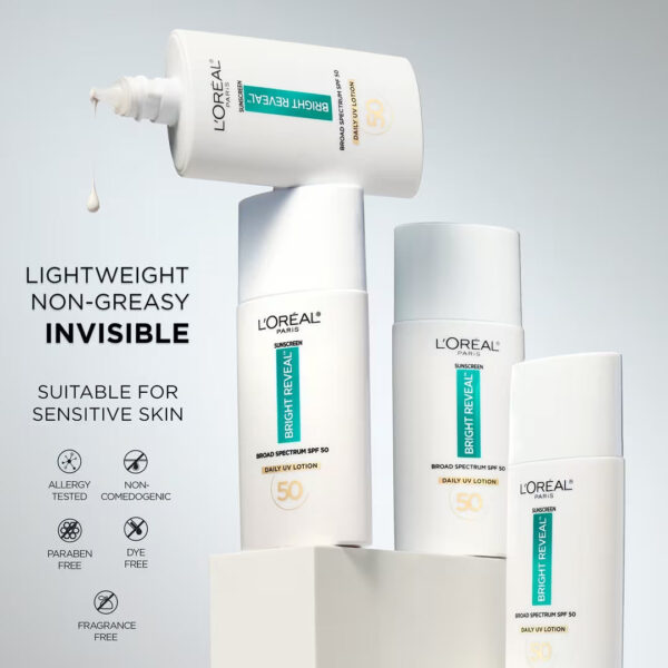 L’Oreal Paris Bright Reveal Daily UV Lotion SPF 50 visibly reduces the appearance of dark spots and helps resist sun-induced signs of aging when used as directed with other sun protection measures