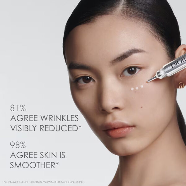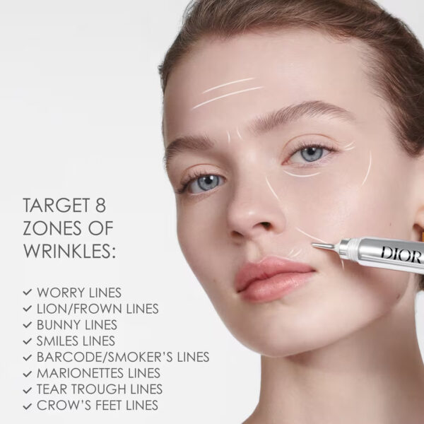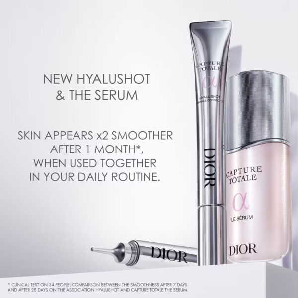 Capture Totale Hyalushot is formulated with a hyaluronic acid duo that targets 8 types of face wrinkles: worry lines, frown lines, bunny lines, smile lines, smoker’s lines, marionette lines, tear trough lines, crow’s feet lines.