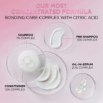 Bond Repair Pre-Shampoo, Shampoo, Conditioner, and Oil-In-Serum for color treated, fragile hair infused with citric acid and a floral scent with notes of rose and sandalwood, reinforces weak bonds, leaving hair silky smooth.