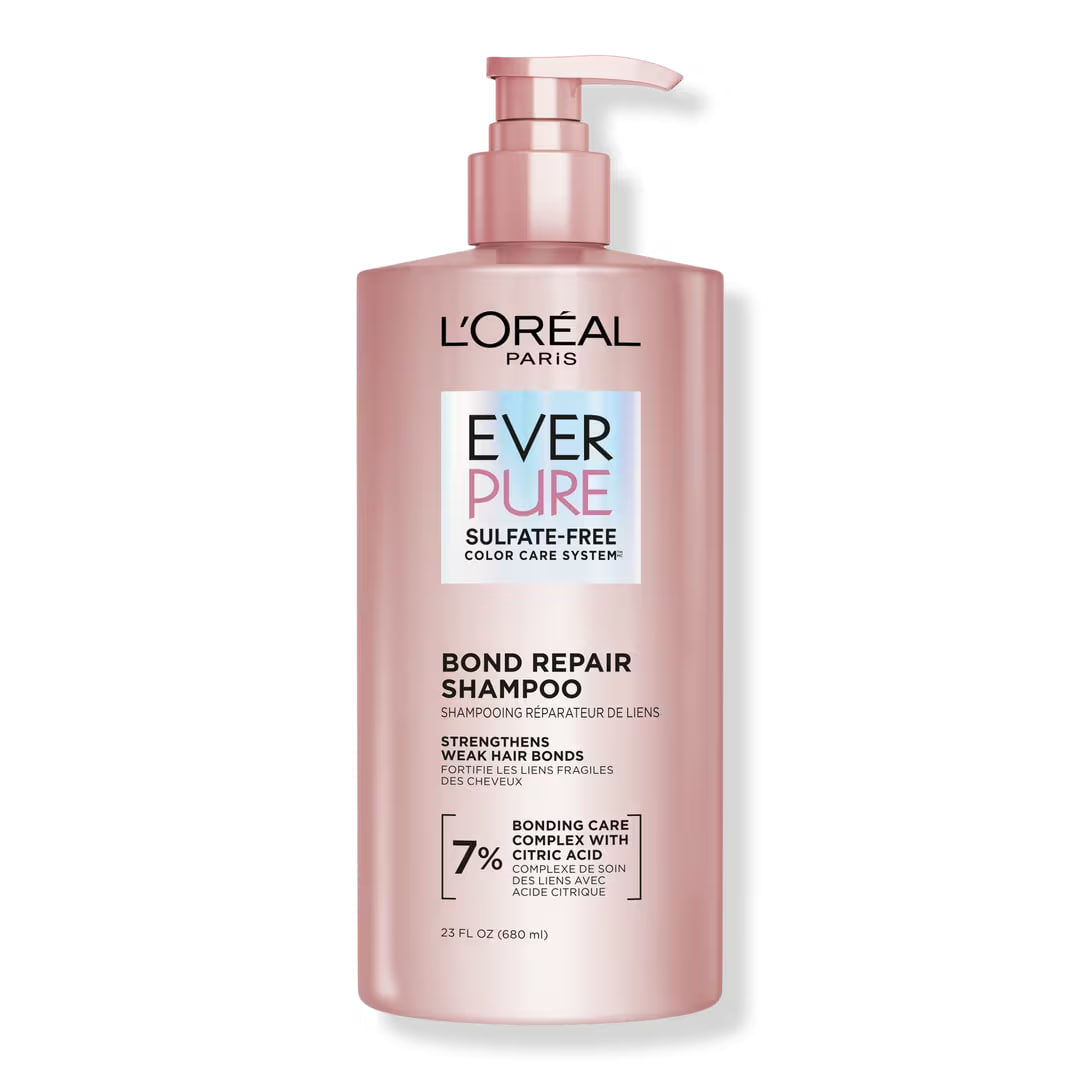 L’Oreal Paris EverPure Sulfate Free Bond Repair Pre-Shampoo treatment, Shampoo, Conditioner, and Oil-in-Serum strengthen weak hair bonds, reduce breakage, and provide hydration and lasting smoothness plus color protection.