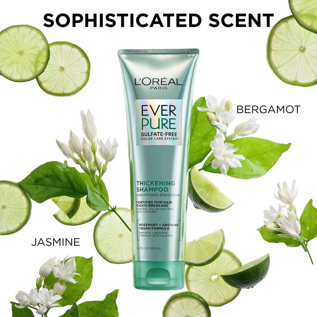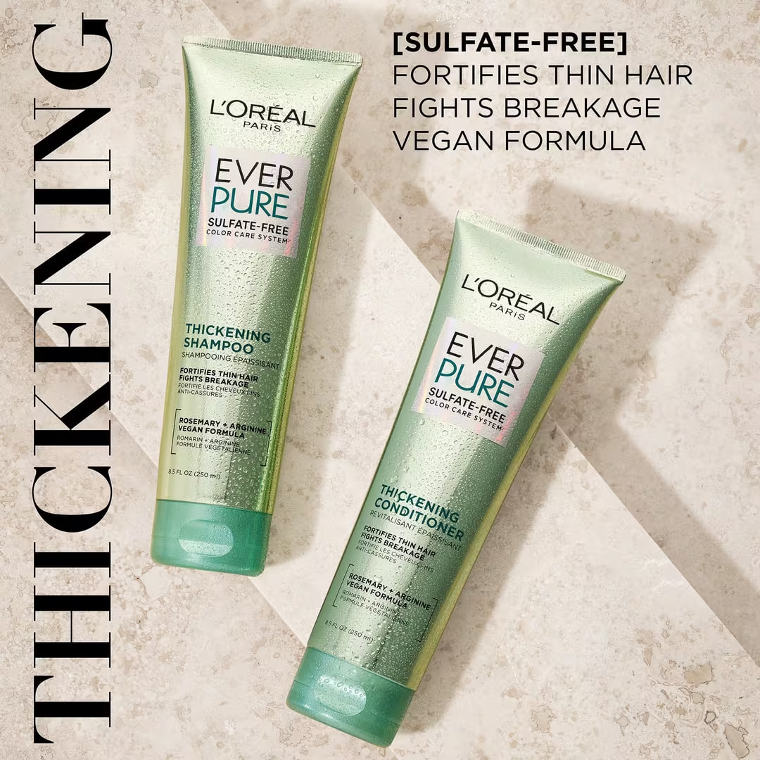 L’Oreal EverPure Sulfate Free Thickening Conditioner strengthen fragile, thin hair to fight breakage and promote strong and thicker looking hair.