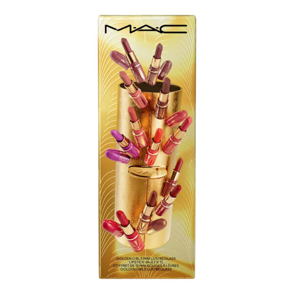 12X MINI MAC LUSTREGLASS LIPSTICK IN DRIPPING RICHES, PAR-TEA TIME, EXPENSE IT!, IMMORTAL CORAL, MONEY MAKER, JACKPOT!, EXTRA DESSERT, SHE OWNS EVERYTHING!, FUN MONEY, STEALTH WEALTH, HIGHEST LEVEL AND MAJESTIC MAGENTA