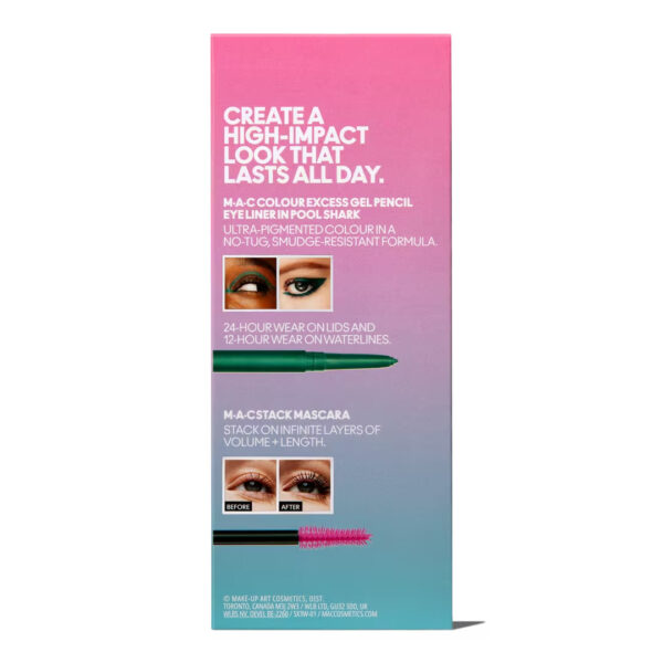MACSTACK MASCARA Ingredients: Water\\Aqua\\Eau, Silica, Stearic Acid, Glyceryl Stearate, Synthetic Beeswax, Paraffin, Polyisobutene, Kaolin, Acrylates/Ethylhexyl Acrylate Copolymer, Aminomethyl Propanediol, Copernicia Cerifera (Carnauba) Wax\\ Copernicia Cerifera Cera \\Cire De Carnauba, Vp/Eicosene Copolymer, Isostearic Acid, Tocopheryl Acetate, Panthenol, Pantethine, Trimethylpentanediol/Adipic Acid/Glycerin Crosspolymer, Peg-9 Dimethicone, Caprylyl Glycol, Hydroxyethylcellulose, Nylon-6, Pvp, Laureth-21, Simethicone, Phenethyl Alcohol, 1,2-Hexanediol, Disodium Edta, Chloroxylenol, Potassium Sorbate, Phenoxyethanol, \[+/- Iron Oxides (CI 77491), Iron Oxides (CI 77492), Iron Oxides (CI 77499), Mica, Yellow 5 Lake (CI 19140), Chromium Oxide Greens (CI 77288), Chromium Hydroxide Green (CI 77289), Carmine (CI 75470), Titanium Dioxide (CI 77891), Bismuth Oxychloride (CI 77163), Yellow 5 (CI 19140), Blue 1 (CI 42090), Blue 1 Lake (CI 42090), Ultramarines (CI 77007), Black 2 (CI 77266 Nano)\] \ COLOUR EXCESS GEL LINER Ingredients: Isododecane, Polymethylsilsesquioxane, Candelilla Wax Hydrocarbons, Synthetic Wax, Trimethylsiloxysilicate, Euphorbia Cerifera (Candelilla) Wax Extract, Hydrogenated Polydicyclopentadiene, Dipentaerythrityl Pentaisononanoate, Caprylyl Glycol, Trihydroxystearin, Synthetic Beeswax, Disteardimonium Hectorite, Propylene Carbonate, Copernicia Cerifera (Carnauba) Wax\\ Copernicia Cerifera Cera \\Cire De Carnauba, Silica, Synthetic Fluorphlogopite, Tin Oxide, Alumina, Benzyl Alcohol, Pentaerythrityl Tetra-Di-T-Butyl Hydroxyhydrocinnamate, \[+/- Mica, Titanium Dioxide (CI 77891), Bronze Powder (CI 77400), Iron Oxides (CI 77491), Iron Oxides (CI 77492), Iron Oxides (CI 77499), Yellow 5 Lake (CI 19140), Ferric Ammonium Ferrocyanide (CI 77510), Copper Powder (CI 77400), Aluminum Powder (CI 77000), Blue 1 Lake (CI 42090), Chromium Oxide Greens (CI 77288), Ultramarines (CI 77007), Ferric Ferrocyanide (CI 77510), Manganese Violet (CI 77742), Bismuth Oxychloride (CI 77163), Chromium Hydroxide Green (CI 77289), Blue 1 (CI 42090), Yellow 5 (CI 19140)\] \