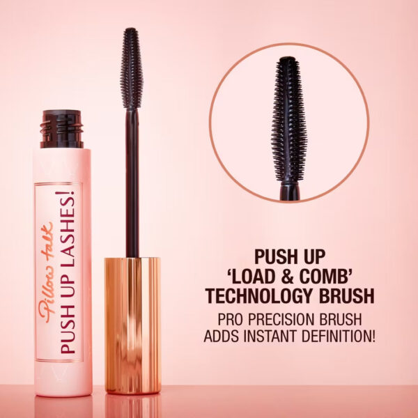 This mascara includes an innovative brush that is designed with a flat side for loading and coating the lashes and a bristle side for combing the mascara, gripping each individual lash from root to tip.