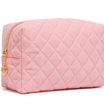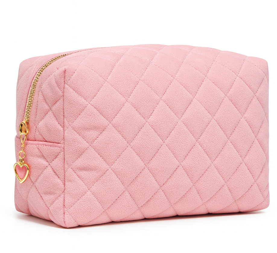 Soft, feminine, and effortlessly chic — the Maysa Quilted Blush Bag adds a touch of romance to your beauty routine. Crafted from quilted velvet in a delicate pastel pink, it features a gold zipper with a heart-shaped charm for a playful yet elegant finish. Perfect for organizing your daily essentials or gifting to someone special.