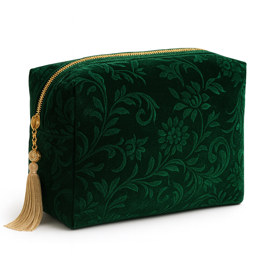 The Maysa Velvet Emerald Classic Bag embodies luxury and tranquility. Crafted from soft embossed velvet with delicate floral patterns, its deep green hue radiates sophistication and calm. Finished with a gold zipper and a refined champagne tassel charm, it’s a timeless accessory that elevates your vanity or travel routine with grace.