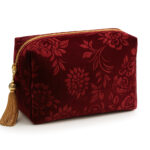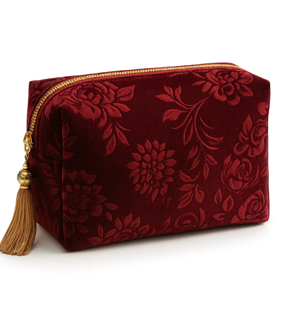 The Maysa Velvet Garnet Classic Bag exudes elegance and warmth with its deep garnet-red tone and floral embossed velvet design. Luxuriously soft to the touch, it’s finished with a gold zipper and a silky tassel charm that adds a refined sparkle. Ideal for storing your beauty must-haves, this bag is where timeless style meets everyday practicality.